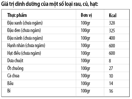 Giá trị dinh dưỡng của một số loại đậu, rau củ (xem bảng).